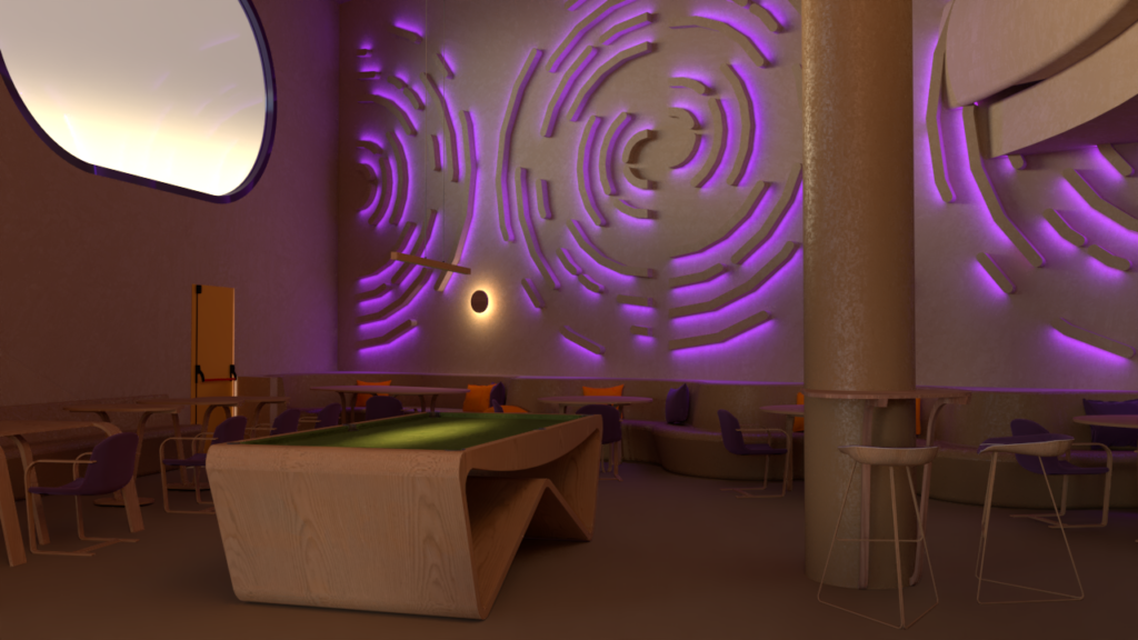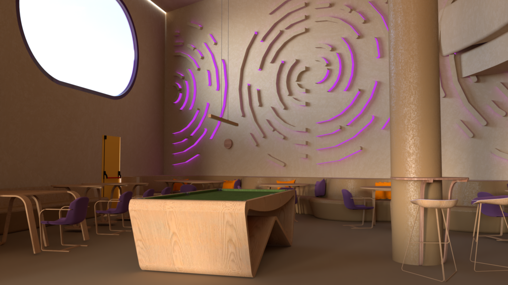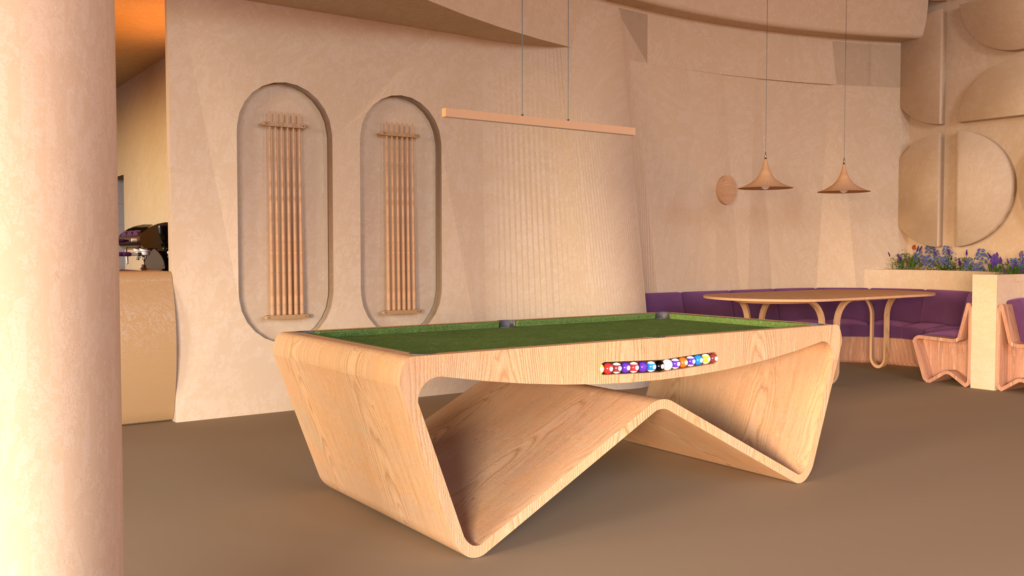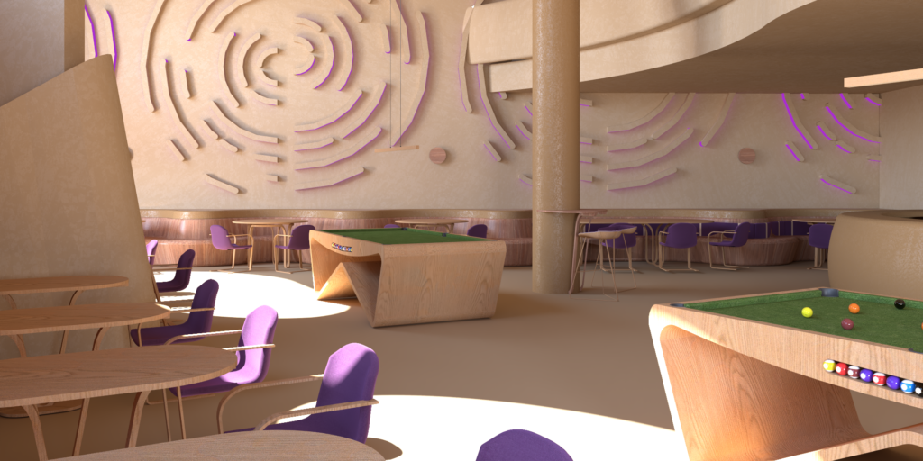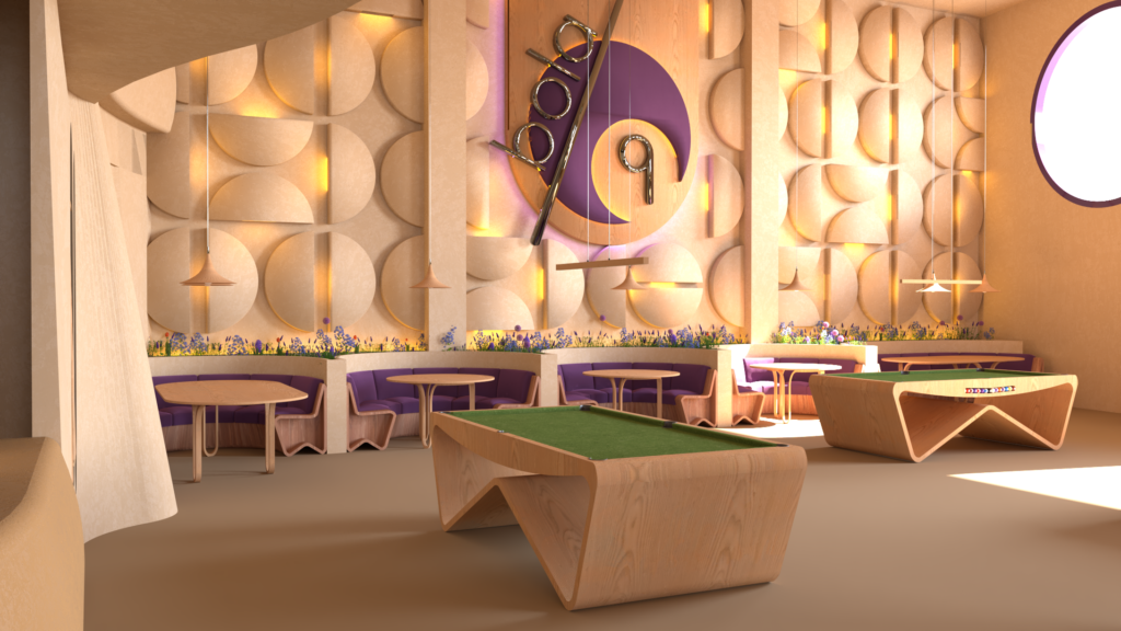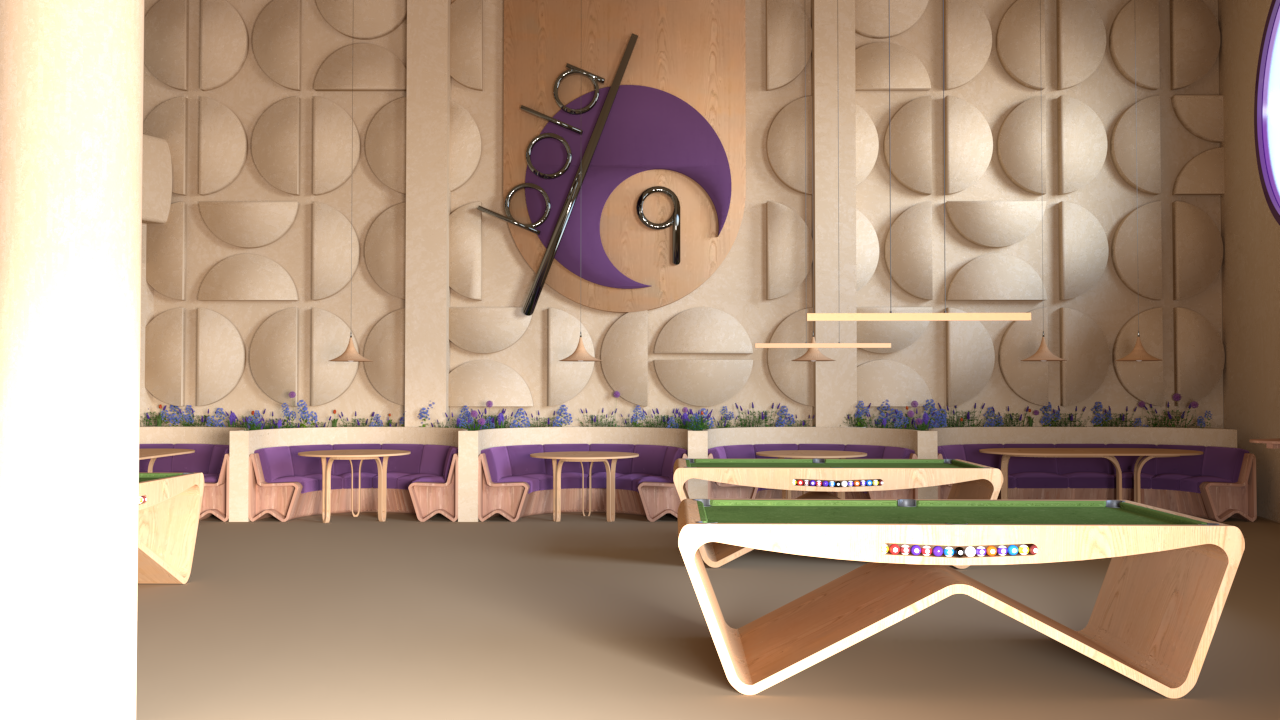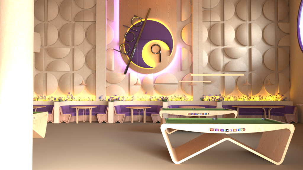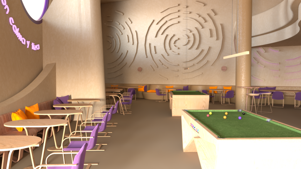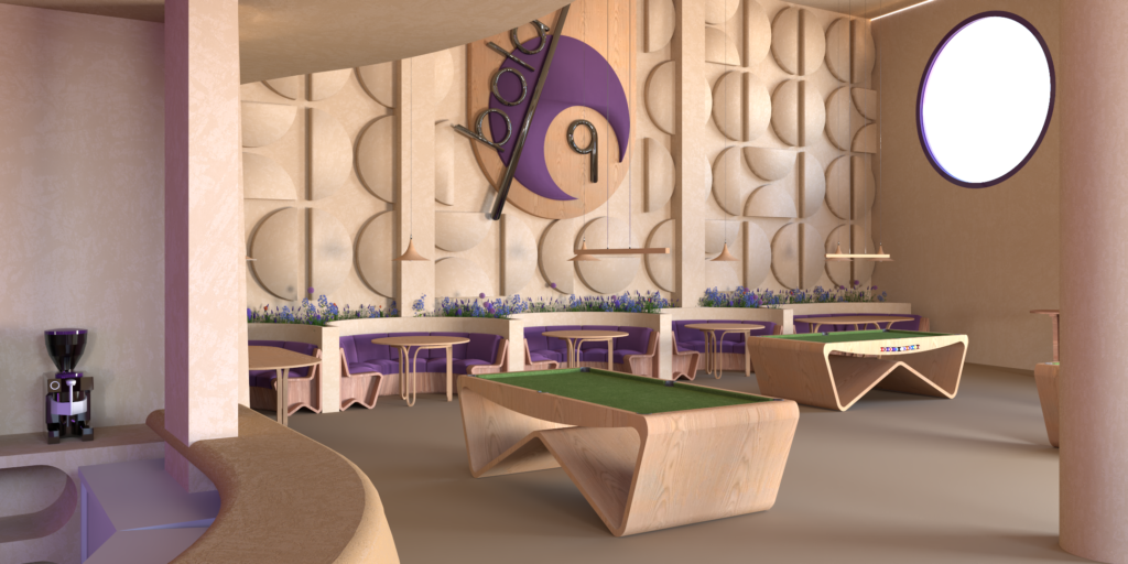 The layout is organized into distinct functional zones that flow naturally: relaxed seating areas, more dynamic social zones, and billiard spaces, understood not only as recreational activities but also as scenographic and cultural elements that give character to the café. The arrangement allows each activity to have its own space while maintaining a sense of openness and continuity.